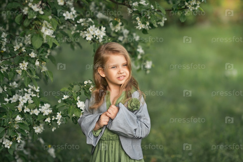 Портрет девочки весной на цветущих деревьях