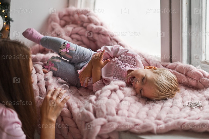 Счастливый ребенок играет на светлом подоконнике