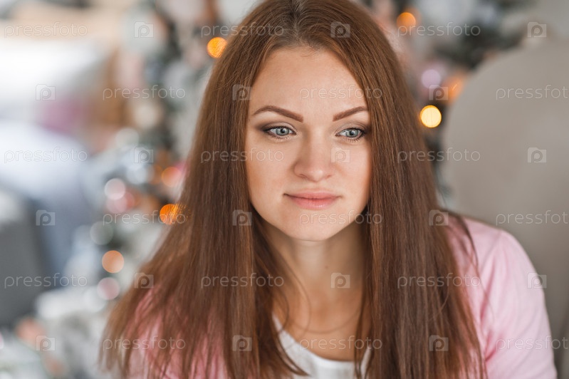Девушка с длинными волосами грустит возле елки