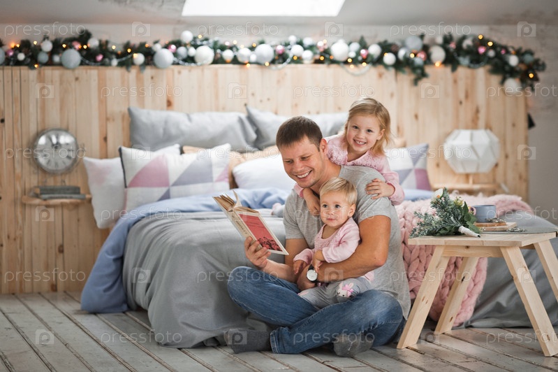 Молодая семья отдыхает дома во время новогодних праздников