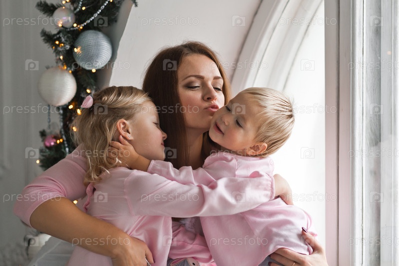 Мама любит играть со своими маленькими дочками у окна
