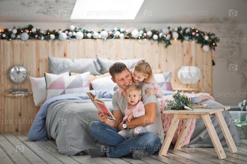 Молодая семья отдыхает дома во время новогодних праздников
