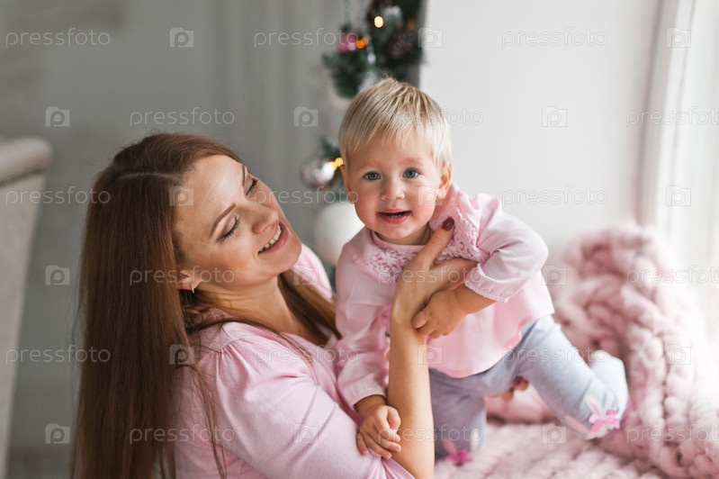 Молодая мама играет у окна со своей маленькой дочерью