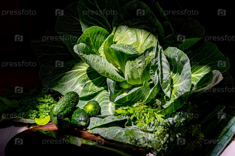 Капуста с овощами и зеленью салата в каплях воды на темном фоне