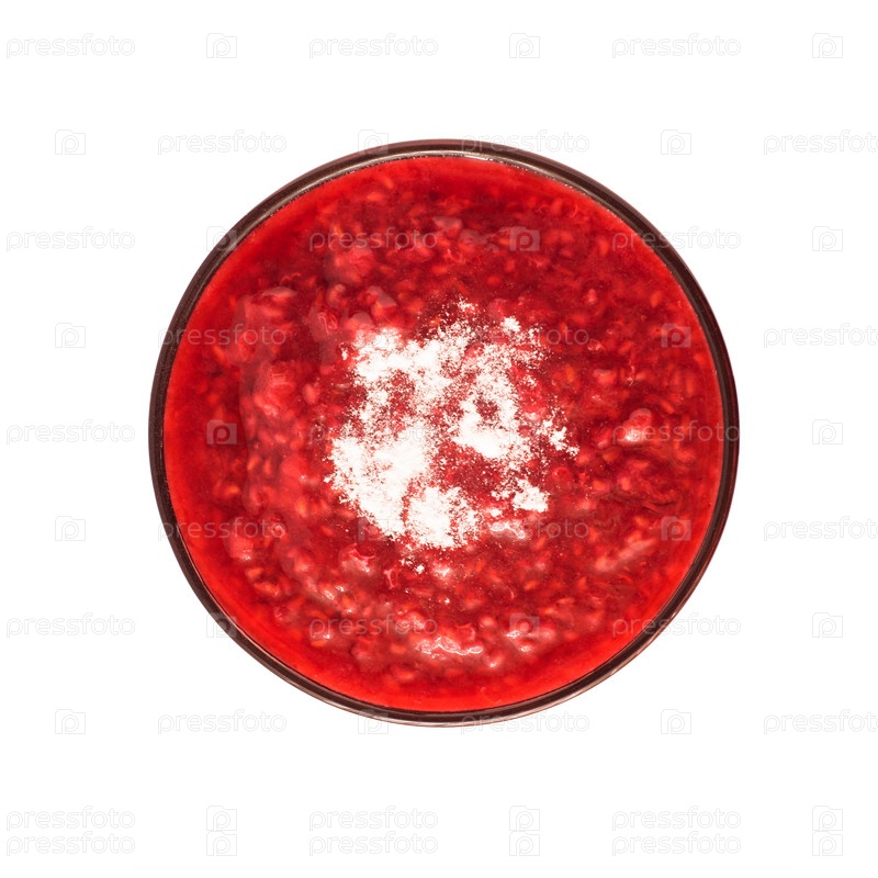 Вид сверху на малиновое варенье с изолированной сахарной пудрой