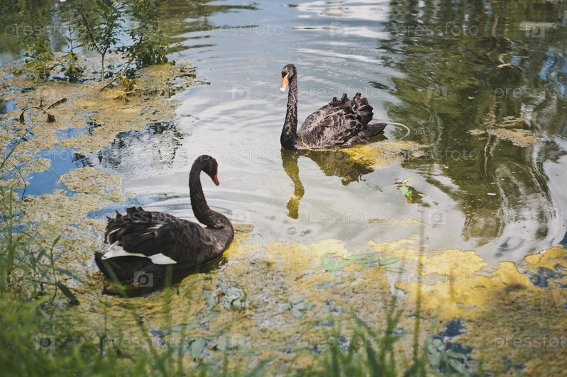 Два черных лебедя плавают в заросшем пруду