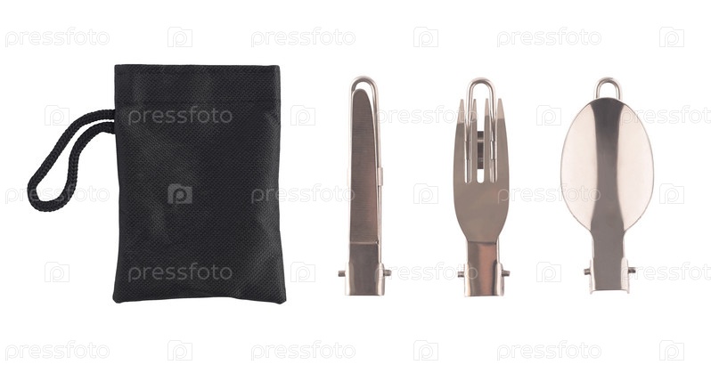 Вид сверху на складной набор столовых приборов и сумку на белом фоне