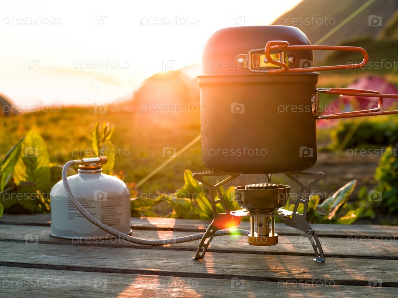 Котелок на походной газовой плите и канистре