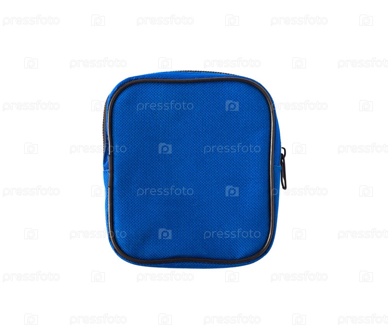 Вид сверху на синюю сумку или чехол с застежкой-молнией на белом фоне