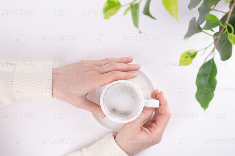 Женские руки в легком свитере держат фарфоровую чашку с кофе