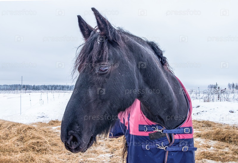 Крупный план взрослой черной лошади в одеяле зимой стоит в загоне с сеном