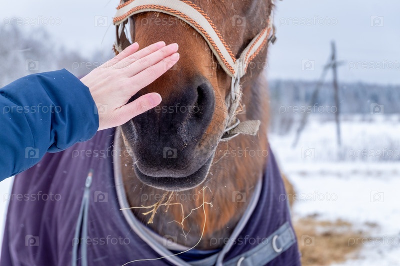 Крупный план женской руки, поглаживающей морду коричневой лошади в сельской местности зимой