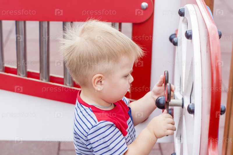 Маленький мальчик увлеченно играет на детской площадке. Успех, творческие идеи и спортивные концепции. Детская площадка