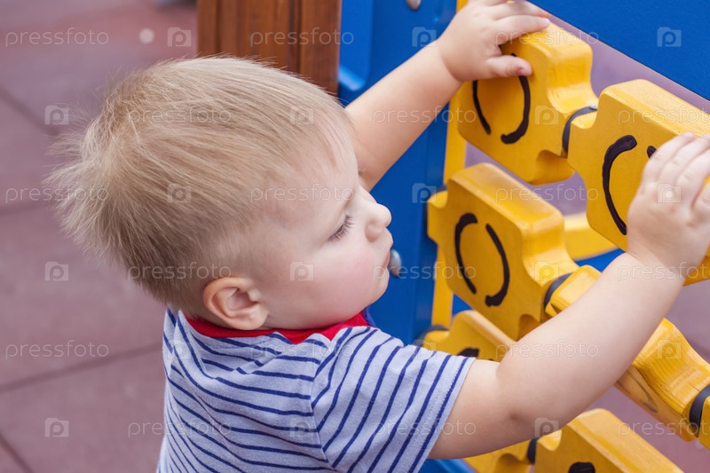 Маленький мальчик увлеченно играет на детской площадке. Успех, творческие идеи и спортивные концепции. Детская площадка