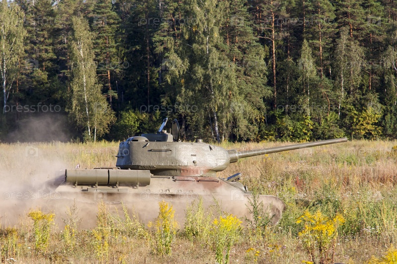 Москва, Россия, 2018-08-25, выставка военной техники, показ военной техники в действии. Военный танк в движении на фоне зеленых деревьев