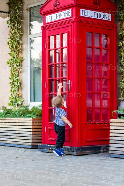 Маленький мальчик хочет войти в красную телефонную будку