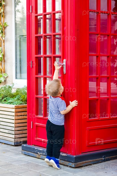 Маленький мальчик хочет войти в красную телефонную будку