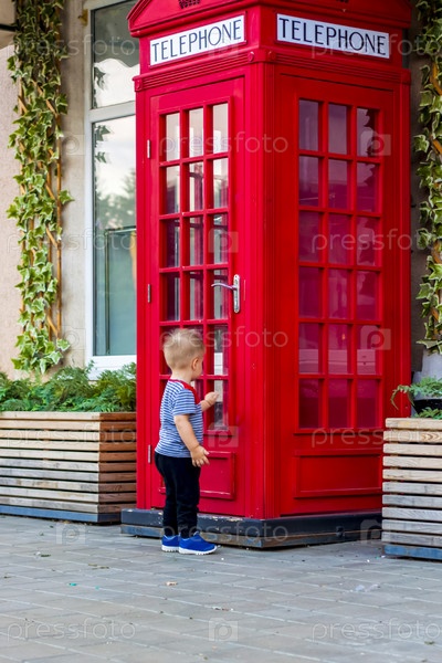 Маленький мальчик хочет войти в красную телефонную будку