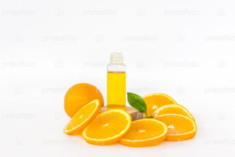 Апельсиновое масло для тела. Нарезанный апельсин на белом фоне. Органическая СПА косметика с растительными компонентами