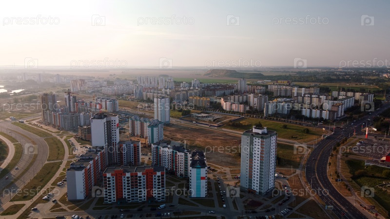 Строительная площадка нового городского квартала. Строительство многоэтажных зданий. Строительная площадка на рассвете. Аэрофотосъемка