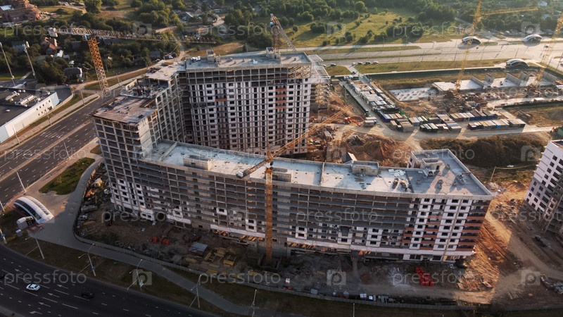 Строительная площадка нового городского квартала. Строительство многоэтажных зданий. Строительная площадка на рассвете. Аэрофотосъемка