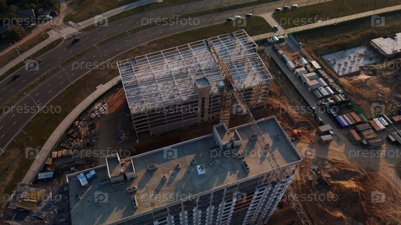 Строительная площадка нового городского квартала. Строительство многоэтажных зданий. Строительная площадка на рассвете. Аэрофотосъемка.