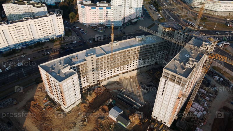 Строительная площадка нового городского квартала. Строительство многоэтажных зданий. Строительная площадка на рассвете. Аэрофотосъемка.