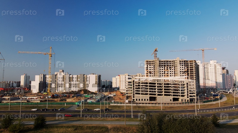 Строительная площадка нового городского квартала. Строительство многоэтажных зданий. Строительная площадка на рассвете. Аэрофотосъемка.