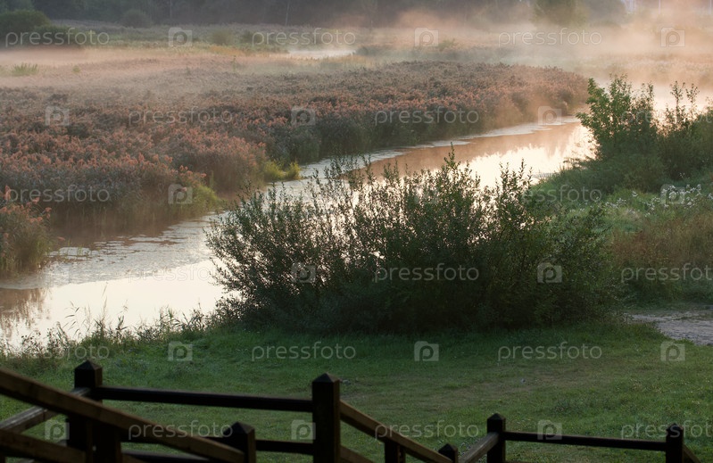 Утренний туман над рекой. Снято на рассвете. На горизонте многоэтажные городские дома.
