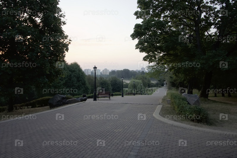 Пешеходные дорожки в городском парке. Винтажные скамейки и фонари. Городской парк на рассвете.
