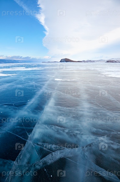 Зимний ледяной пейзаж на озере Байкал с драматическими погодными облаками перед штормом