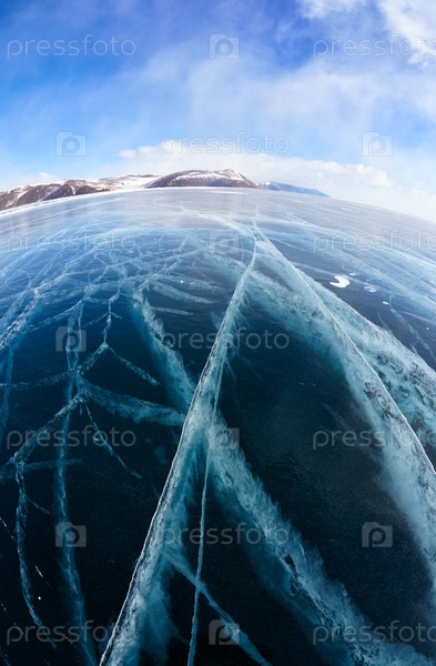 Зимний ледяной пейзаж на сибирском озере Байкал с облаками