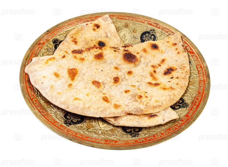 Индийский тандури роти на латунной тарелке изолирован