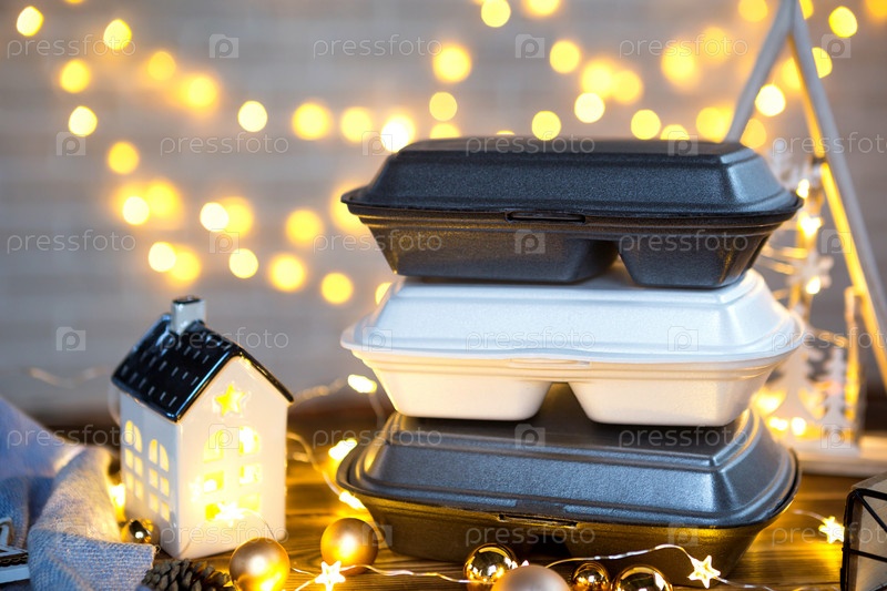 Рождественский декор контейнеров службы доставки еды. Предновогодняя акция. Готовый горячий заказ, одноразовая пластиковая коробка в сказочном свете. Работа по организации питания в праздничные дни. Скопируйте пространство, макет