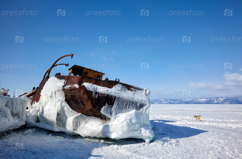 Старый замороженный корабль на берегу острова Ольхон на озере Байкал