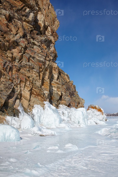 Скалы, покрытые льдом на зимнем сибирском озере Байкал