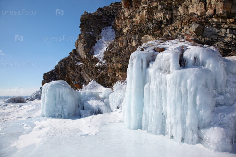Скалы, покрытые льдом на зимнем сибирском озере Байкал