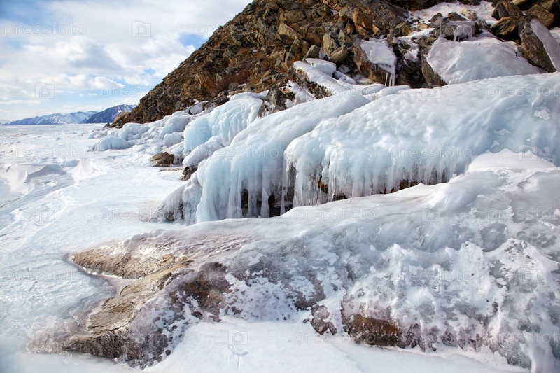 Скалы, покрытые льдом на зимнем сибирском озере Байкал