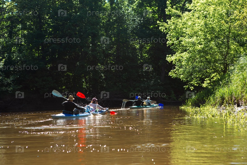 Семейный поход на байдарках. Мужчина и женщина и пожилые пары старший и старший гребная лодка на реке, поход на воду, летнее приключение. Экологичный и экстремальный туризм, активный и здоровый образ жизни