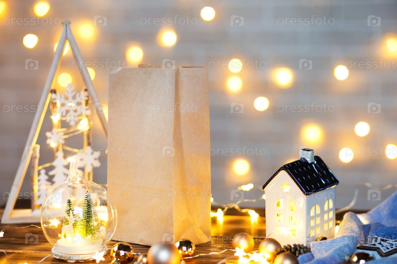 Рождественский декор бумажного пакета службы доставки еды на столе. Готовый заказ, экологически чистая перерабатываемая упаковка. Праздничное питание, изготовление десертов, печенья и сладостей домашнего приготовления. макет