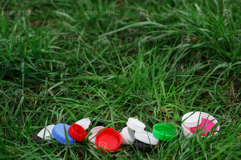 Красочные крышки пластиковых бутылок на зеленой траве. Волонтерская благотворительная акция «Добрые крышки» в помощь детям-сиротам