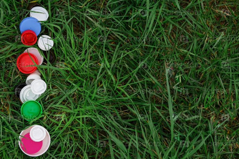 Красочные крышки пластиковых бутылок на зеленой траве. Волонтерская благотворительная акция «Добрые крышки» в помощь детям-сиротам