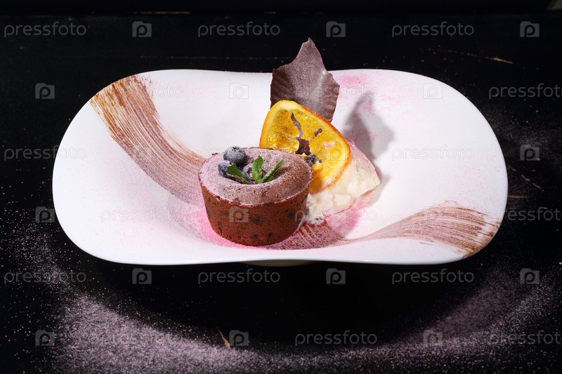 Шоколадный флан с ванильным мороженым на белой тарелке