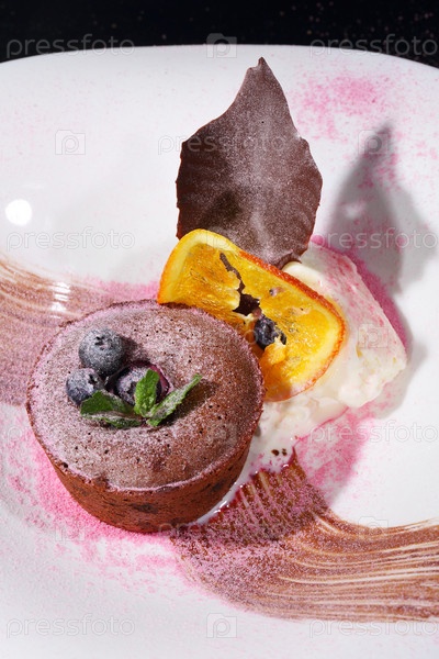 Шоколадный флан с ванильным мороженым на белой тарелке