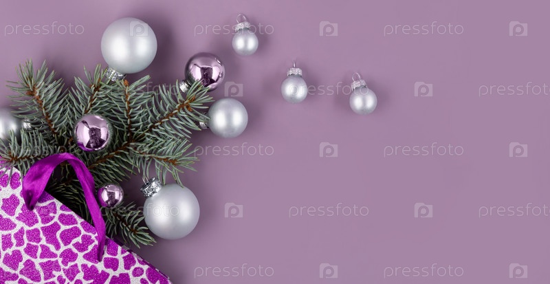 Вид сверху на серебряные шарики из подарочной коробки с еловыми ветками на модном фиолетовом фоне. Макет фона новогодних праздников с