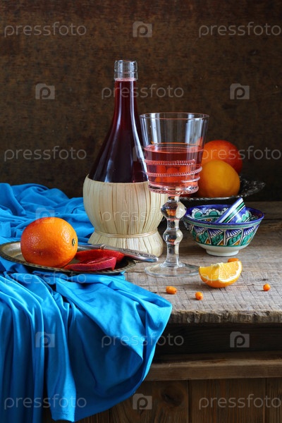 Натюрморт с вином и красными апельсинами