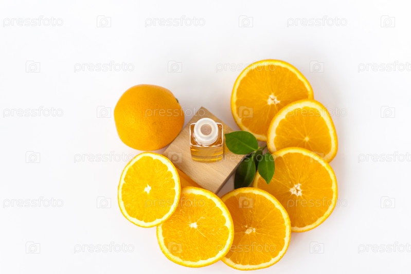 Оранжевое масло для тела. нарезанный апельсин на белом фоне. органическая косметика SPA с растительными ингредиентами