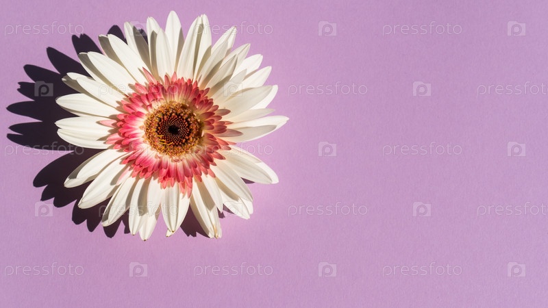 Белая гербера на фиолетовом фоне, плоская планировка