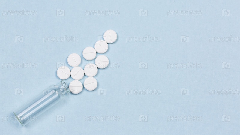 Бутылка с таблетками и белые таблетки на синем фоне