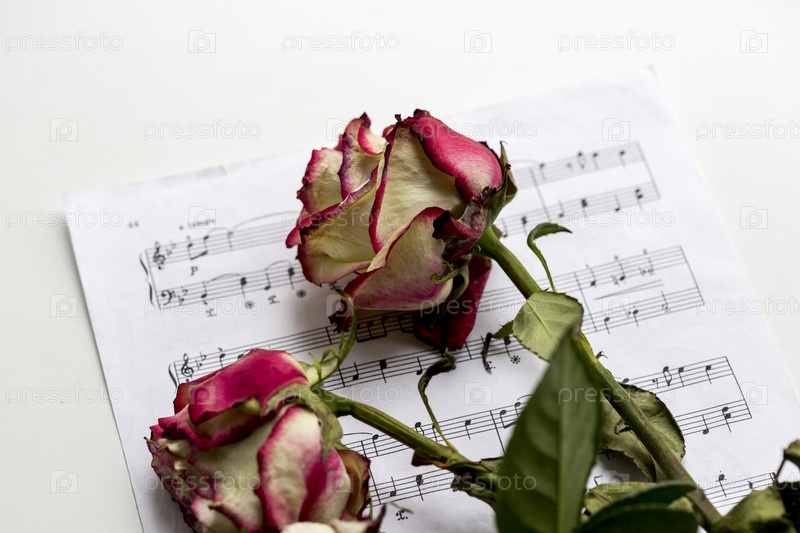 Нотный лист и мертвые розы. Идея концепции для любви к музыке, для композитора, музыкального вдохновения